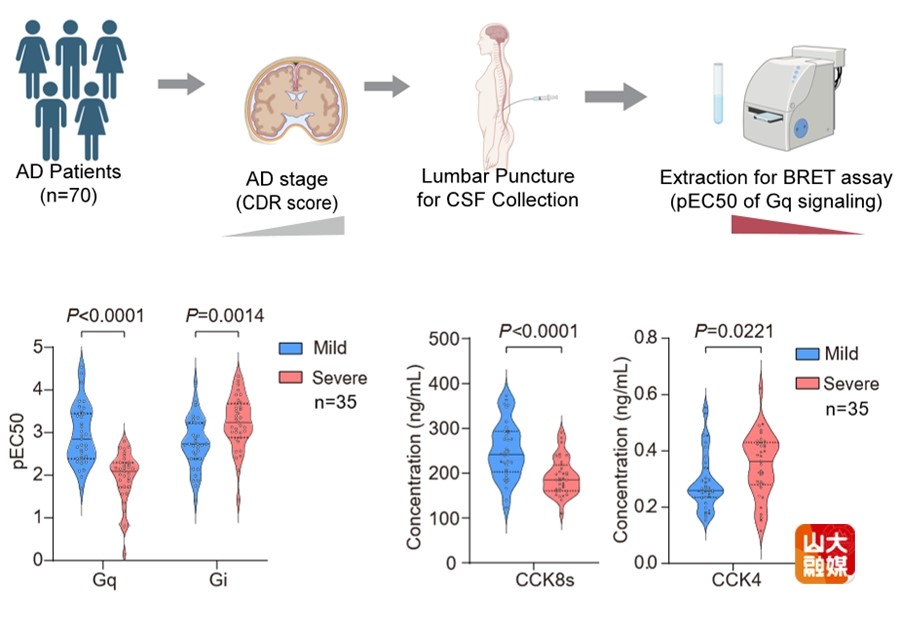The research team detected cerebrospinal fluid samples from Alzheimer's disease patients and observed a progressive decline in CCKBR-mediated Gq signaling activity alongside increasing Gi signaling activity as the disease advanced. Their findings further indicated that activation of either Gs or Gq signaling pathways downstream of CCKBR exerts neuroprotective effects, whereas the Gi pathway is not involved in this process. Clinical sample analysis revealed a significant correlation between AD severity and reduced CCK8s levels coupled with elevated CCK4 levels in cerebrospinal fluid, suggesting that CCKBR signaling imbalance may play an important role in AD pathogenesis. Collectively, these results demonstrate the positive regulatory function of the CCKBR-Gq signaling axis in AD progression, highlighting its therapeutic targeting as a promising strategy for Alzheimer's disease treatment.