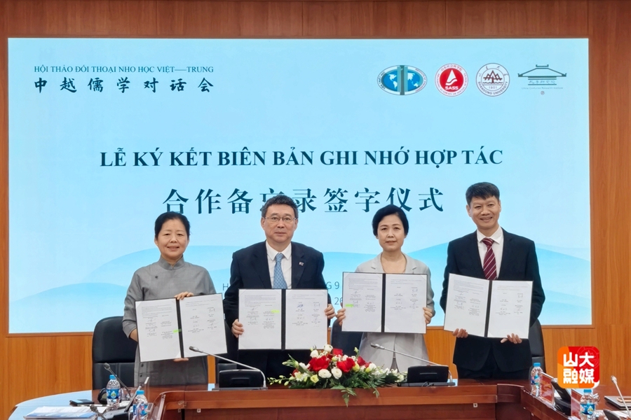 A memorandum of understanding on research collaboration and talent cultivation is signed by SDU, the Shandong Academy of Social Sciences, the China Confucius Research Institute, and VASS at the opening ceremony of the event. [Photo/Shandong University]
