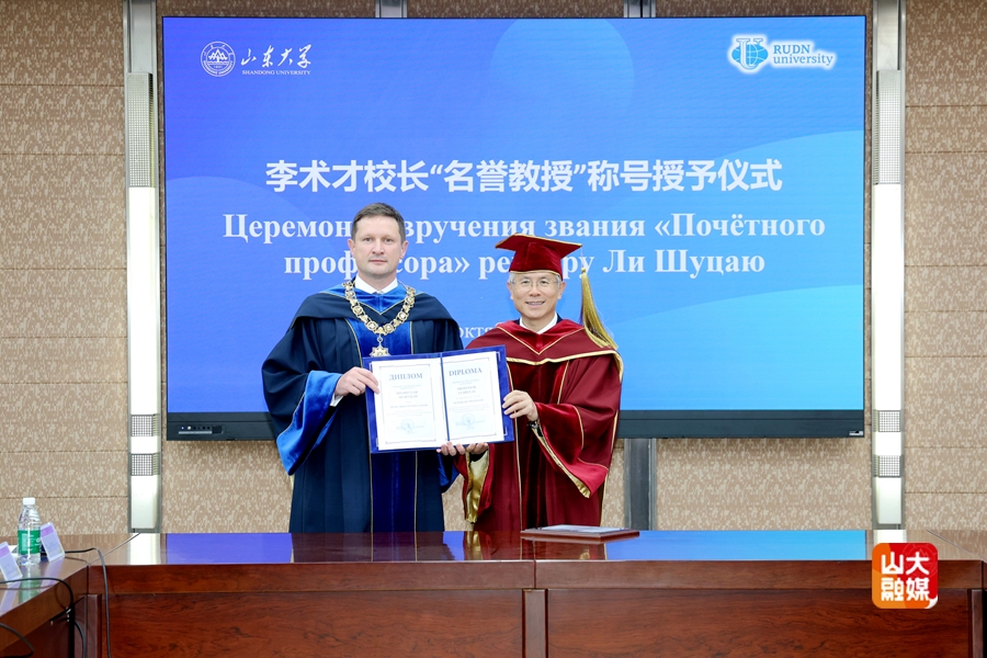 During the visit, Oleg Yastrebov confers the title of "Honorary Professor" and a gown on President Li Shucai. [Photo/Shandong University]