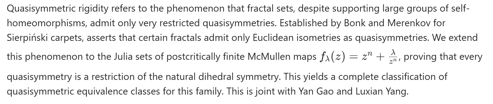 Jinsong Zeng is currently an associate professor at Shenzhen University. He obtained his PhD from Fudan University and was a postdoc at CAS. Before joining Shenzhen University, he was an associate professor at Guangzhou University. Professor Zeng works in the field of complex dynamics, including combinatorial invariants of rational functions, Newton maps, decomposition of rational functions. He has published papers in Adv. Math., Trans. Amer. Math. Soc., Sci. China Math., Fund. Math., Ergo. Theo. Dyn. Sys.