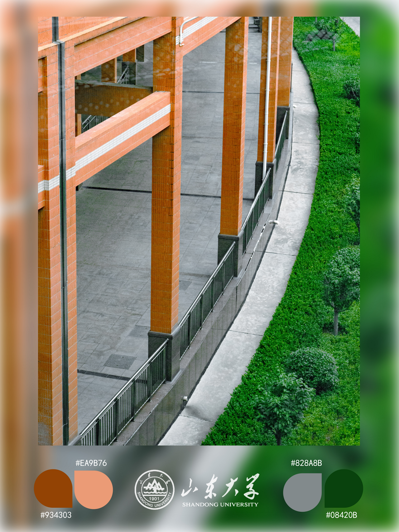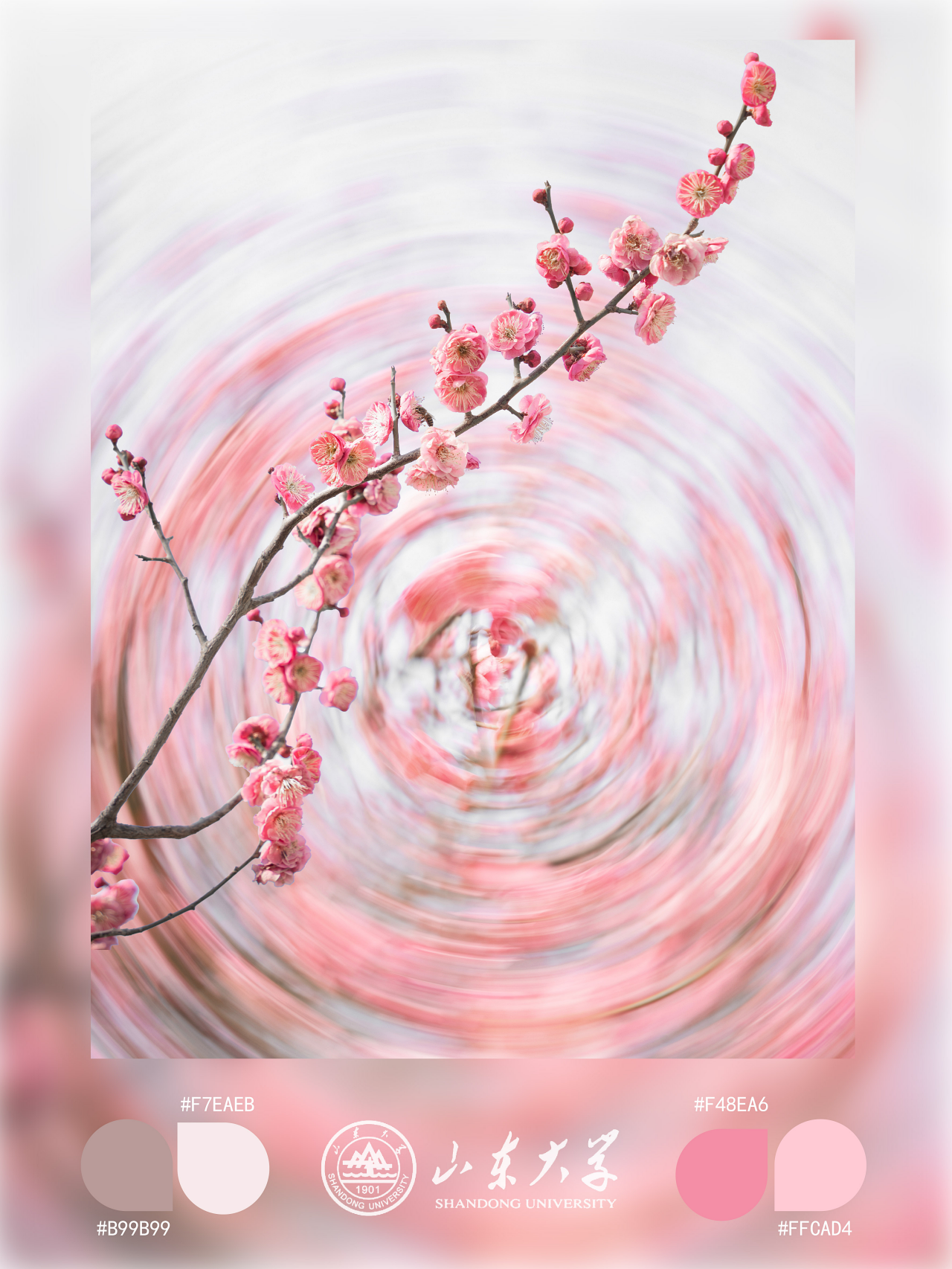 Shandong University transforms into a living canvas as the seasons turn. Spring whispers in blush pink. Flower-laden branches brush warm brick-red colonnades, as lazy shadows wander stone railings under a pale pink misty sky.