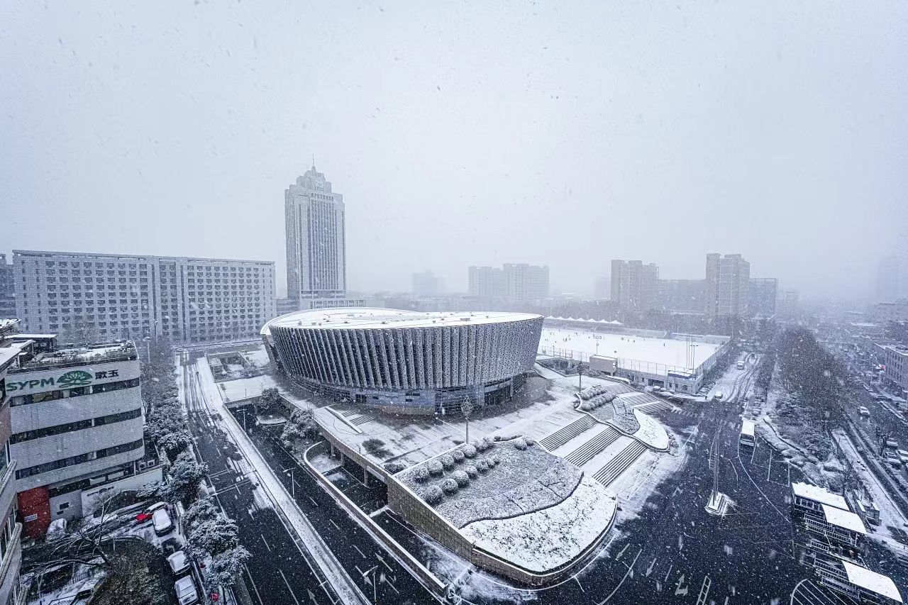 An aerial view of the snow-covered stadium. [Photo/Shandong University]