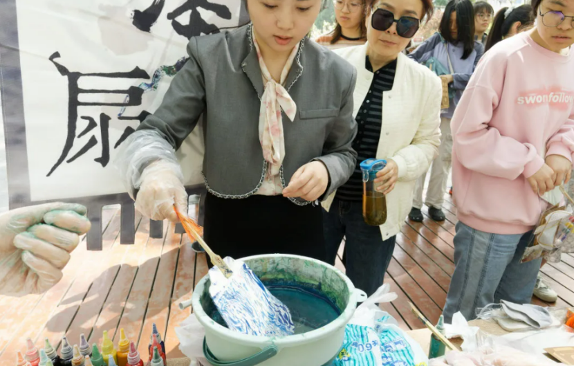 The fair featured performances such as a cross-talk, a hanfu show, and a lion dance, along with interactive activities like intangible cultural heritage quizzes and guessing characters from oracle bone script, one of China's earliest forms of writing. Students also participated in handicraft activities like tie-dyeing, lacquer fan painting, mother-of-pearl inlaying, and movable-type printing.