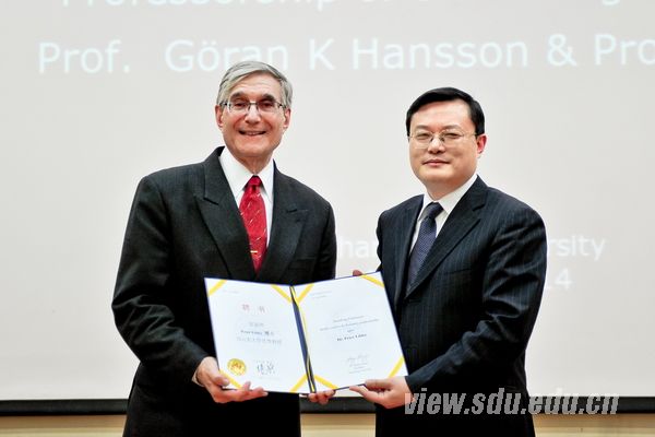 The Conferring Ceremony for Honorary Professorship of SDU was held in the Lecture Hall of the Complex Building, Baotuquan Campus, Shandong University on March 17th. Goran K Hansson, a Distinguished Professor at Karolinska Institute in Stockholm, Sweden, Secretary General of the Nobel Committee for Physiology or Medicine, and Peter Libby, a Professor of Medicine at Harvard University Medical School, Chief of Cardiovascular Medicine at Brigham and Women’s Hospital in Boston, Massachusetts, the U.S., were awarded Honorary Professorships by SDU President Zhang Rong.