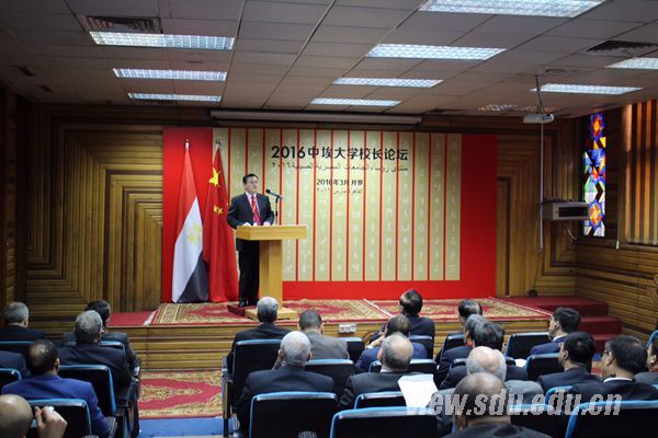 This year, the forum centered on "The Belt and Road Initiative and China-Egypt people-to-people exchange" and four main issues were under discussion, including "ancient civilized society and modernization", "youth exchange and culture understanding", "scientific research cooperation and technology innovations" and "internationalization and localization of universities". In the speech of "Youth Exchange and Culture Understanding", Zhang employed several examples to convey that culture has an ever-lasting profound influence on society and youth are filled with potential and creativity. He also illustrated that Shandong University had made an enormous effort to promote global civilization dialogue as well as people-to-people and cultural exchanges. He remarked that the act that Chinese people and Arab people inherited the legacy of ancient Silk Road and promoted the construction of the "Belt and Road Initiative" will definitely forge a tight bond between two sides. It will encourage young people from both countries to exchange ideas, deepen mutual understanding, develop together and maintain close friendship for generations. Zhang presented a brief review of the four topics in his concluding speech, expressing his anticipation of keeping the friendship between China and Egypt and yielding the fruits of President Xi's visit to Egypt on the 60th anniversary of the establishment of China-Egypt diplomatic relations. The year of 2016 belongs to the cultural exchanges between two sides, and it is highly advocated that universities and colleges in both countries, who witness and undertake the responsibility of China-Egypt comprehensive strategic partnership, join together to promote education cooperation and culture exchanges in different forms.