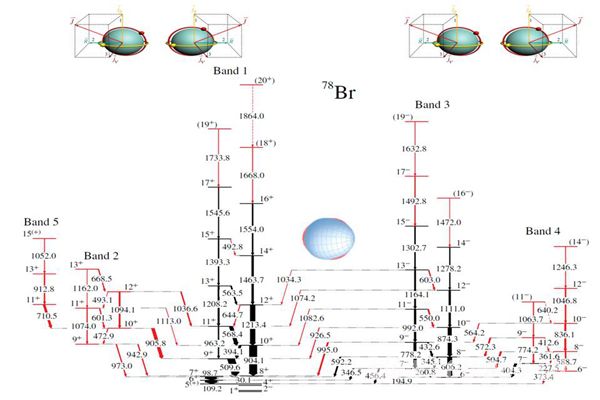 Recently, scientists from Shandong University, Weihai; Peking University; Beijing University of Aeronautics and Astronautics; Institute of Theoretical Physics, Chinese Academy of Sciences; Tsinghua University; South Africa and Hungary have studied the level structures of Br-78 through the heavy ion fusion evaporation reaction using the accelerator and detector array at iThemba LABS in South Africa. They have found two pairs of chiral doublet bands with opposite parities together with strong electric dipole linking transitions. Calculations based on the covariance density functional theory and particle rotor model indicate that the present observation provides evidence for multiple chiral doublet bands with octupole correlations.