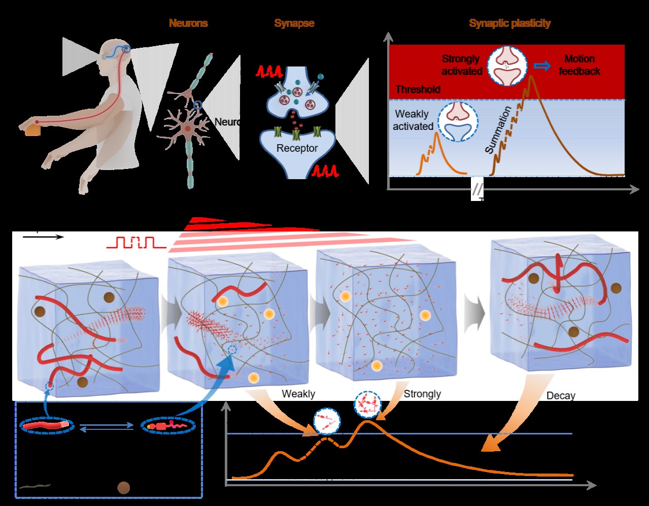 Figure 2. Schematic illustration of information transmission controlled by neural synapse and generation of motion feedback in biological visual perception. In the hydrogel-based artificial synapse, the photothermal-induced controllable assembly of amphiphilic molecules converts the infrared optical pulse signal into the cumulative electrical signal, simulating the intelligent function of the neural synapse.