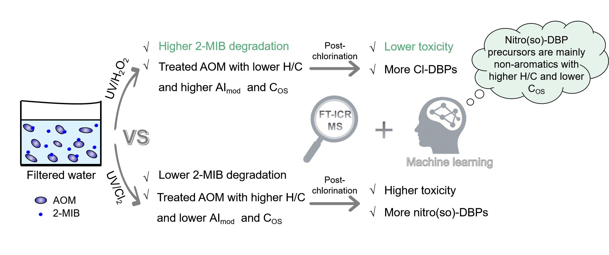 Global climate change and the intensification of water eutrophication have led to frequent cyanobacterial blooms, releasing odorous compounds such as 2-methylisoborneol (2-MIB), which pose a serious threat to drinking water safety. Dominant algal species, represented by Pseudanabaena, are the main sources of 2-MIB. Even after conventional coagulation and filtration, a substantial amount of extracellular 2-MIB remains difficult to remove. To address the high-odor problem caused by cyanobacterial blooms in water sources, this study compared the effectiveness of two commonly used UV-based AOPs (UV/Cl2 and UV/H2O2) in removing odor compounds. It also analyzed the differences in toxicity and disinfection byproducts (DBPs) in the treated water, and employed FT-ICR MS combined with machine learning to investigate the precursor characteristics of chloro-DBPs (Cl-DBPs) and nitro(so)-DBPs.