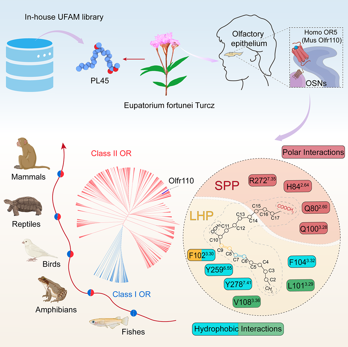The study screened and identified PL45, a natural unsaturated fatty acid from Eupatorium fortunei, as an effective activator of mouse Olfr110. Using cryo-electron microscopy (cryo-EM), the research resolved the structure of the PL45-Olfr110-Gs complex, and discovered that Olfr110 harbors a unique ultra-large ligand-binding pocket. Further studies confirmed that other members of the OR5 family within Class II olfactory receptors (e.g., OR5M9, OR5H6, OR5R1) can also be activated by unsaturated fatty acids, employing a dual-pocket architecture consisting of a "small polar pocket + large hydrophobic pocket" that recognizes the polar head and hydrophobic fatty chain of ligands, respectively. This study is the first to uncover the structural mechanism underlying the recognition of hydrophobic odorants by Class II olfactory receptors, providing critical theoretical basis for understanding the functional adaptation of olfactory receptors during the evolution of vertebrates from aquatic to terrestrial habitats.