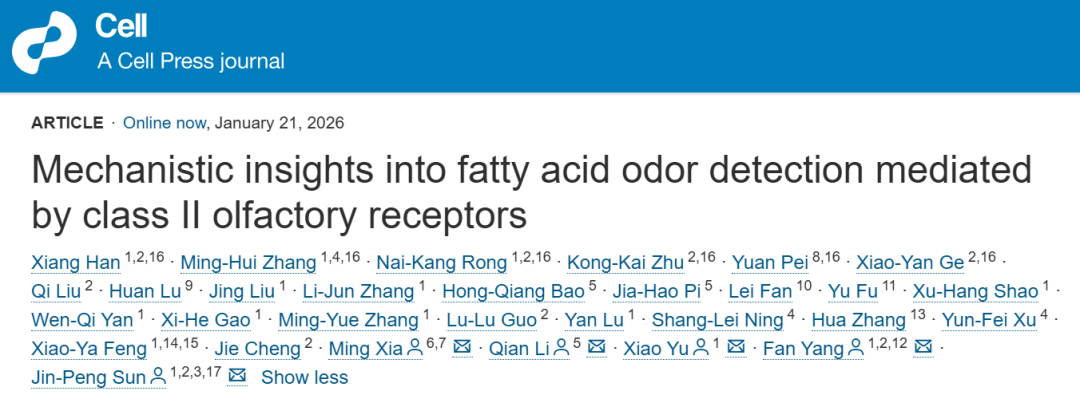 The second study, “Mechanistic Insights into Fatty Acid Odor Detection Mediated by Class II Olfactory Receptors”, was conducted by the teams of Professor Sun Jinpeng, Professor Yu Xiao and Professor Yang Fan from Shandong University, in conjunction with Researcher Li Qian from Shanghai Jiao Tong University School of Medicine and Professor Xia Ming from Shandong First Medical University. Professors Sun Jinpeng, Yang Fan, Yu Xiao, Researcher Li Qian and Professor Xia Ming are the co-corresponding authors. The co-first authors include Dr. Han Xiang (PhD Candidate), Dr. Zhang Minghui (PhD Candidate), Dr. Rong Naikang (PhD Candidate) from the School of Basic Medical Sciences, Shandong University; Associate Researcher Zhu Kongkai, Dr. Ge Xiaoyan (Postdoctoral Fellow) from the Advanced Institute of Medical Sciences, Shandong University; and Assistant Researcher Pei Yuan from ShanghaiTech University.