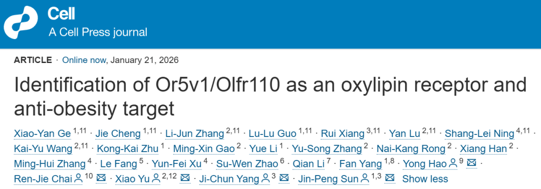 The first study, “Identification of Or5v1/Olfr110 as an oxylipin receptor and anti-obesity target”, was led by the teams of Professor Sun Jinpeng and Professor Yu Xiao from Shandong University, in collaboration with Professor Yang Jichun from Peking University, Professor Chai Renjie from Southeast University, and Professor Hao Yong from Renji Hospital Affiliated to Shanghai Jiao Tong University School of Medicine. Professors Sun Jinpeng, Yang Jichun, Yu Xiao, Chai Renjie and Hao Yong are the co-corresponding authors. The co-first authors include Dr. Ge Xiaoyan (Postdoctoral Fellow), Professor Cheng Jie, Dr. Zhang Lijun (PhD Candidate), Professor Guo Lulu from the Advanced Medical Research Institute, Shandong University; Dr. Xiang Rui (Postdoctoral Fellow) from the School of Basic Medical Sciences, Peking University; Dr. Lu Yan (Postdoctoral Fellow), Dr. Ning Shanglei, Dr. Wang Kaiyu (PhD Candidate) from Shandong University.