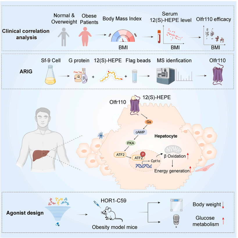 Using the self-developed "ARIG" technology, the research identified the olfactory receptor Or5v1/Olfr110 (human ortholog OR5V1) as a high-affinity receptor for the oxylipin 12(S)-HEPE. Unlike traditional olfactory receptors that recognize environmental odorants with low affinity, 12(S)-HEPE—an endogenous ligand—activates Or5v1/Olfr110 at the nanomolar level. Analysis of clinical cohorts revealed a negative correlation between 12(S)-HEPE levels and clinical BMI indices. Mechanistically, 12(S)-HEPE promotes hepatic fatty acid oxidation through the Olfr110-Gs-PKA-pATF2-Cpt1α signaling pathway, thereby improving glycemic homeostasis and alleviating obesity. HOR1-C59, a small-molecule agonist developed to target this receptor, exerts Olfr110-dependent metabolic improvement effects.