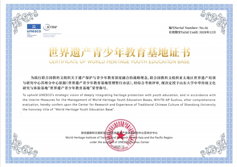 Following a rigorous evaluation by experts from the UNESCO Regional Office for East Asia and the World Heritage Institute of Training and Research for the Asia and the Pacific Region (WHITRAP), the Center for Research and Experience of Traditional Chinese Culture at Shandong University (SDU) has been designated as a "World Heritage Youth Education Base". This honorary title recognizes the university's commitment to cultural preservation and pedagogical innovation.