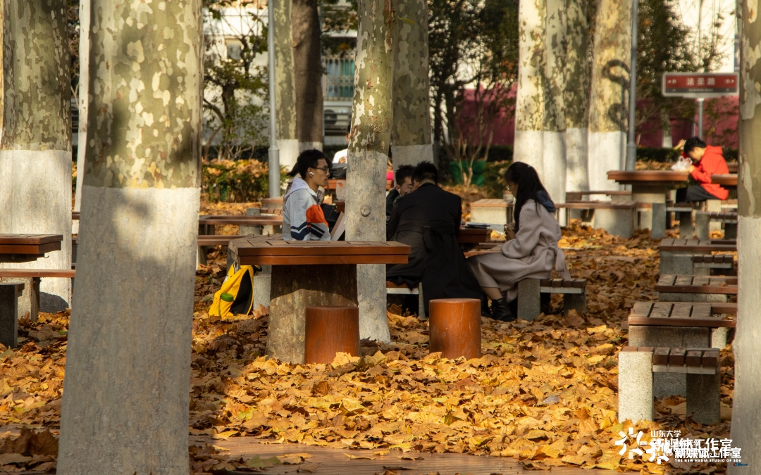 Students read, talk and picture their bright future as their campus is covered with fallen leaves in early winter. [Photo/view.sdu.edu.cn]